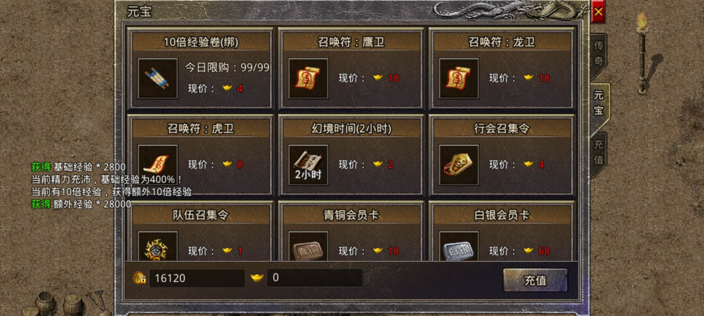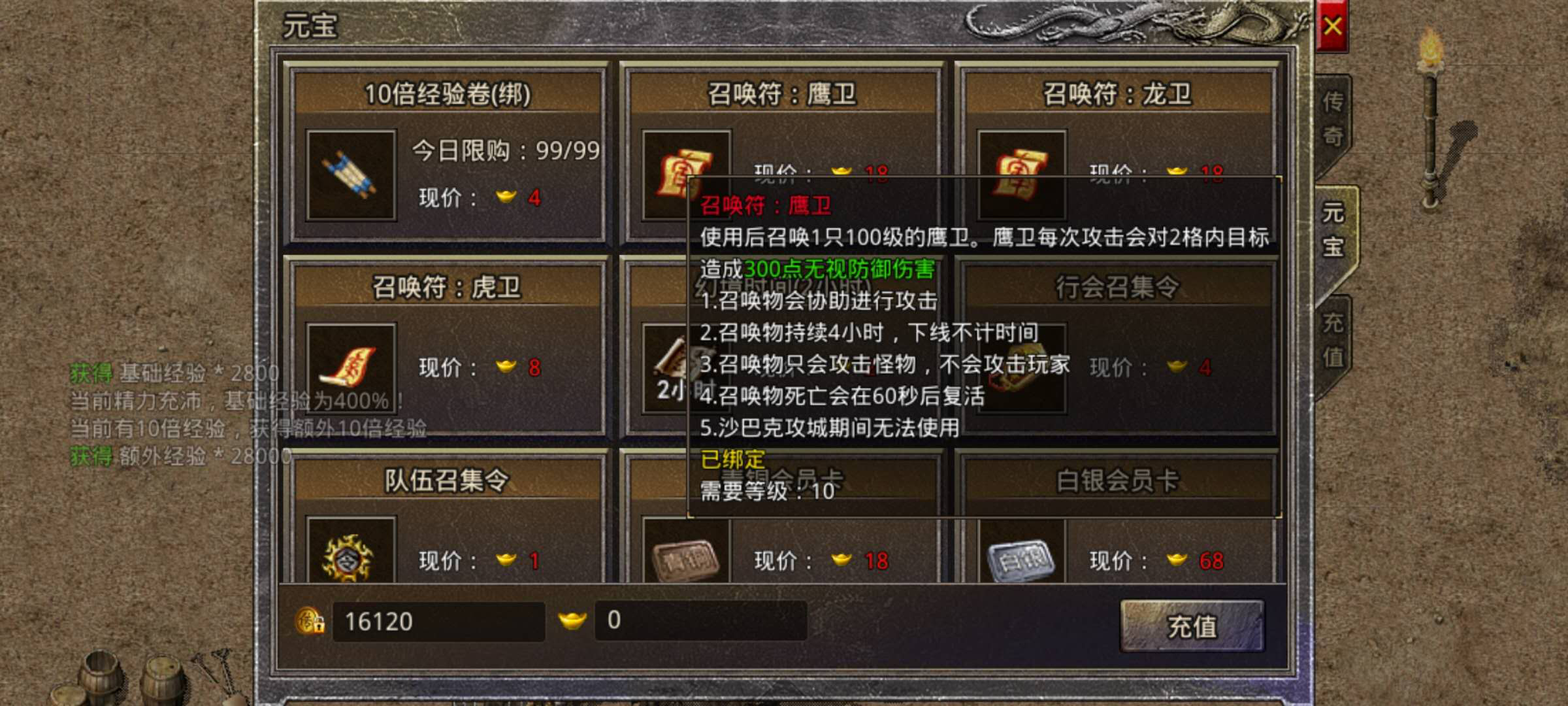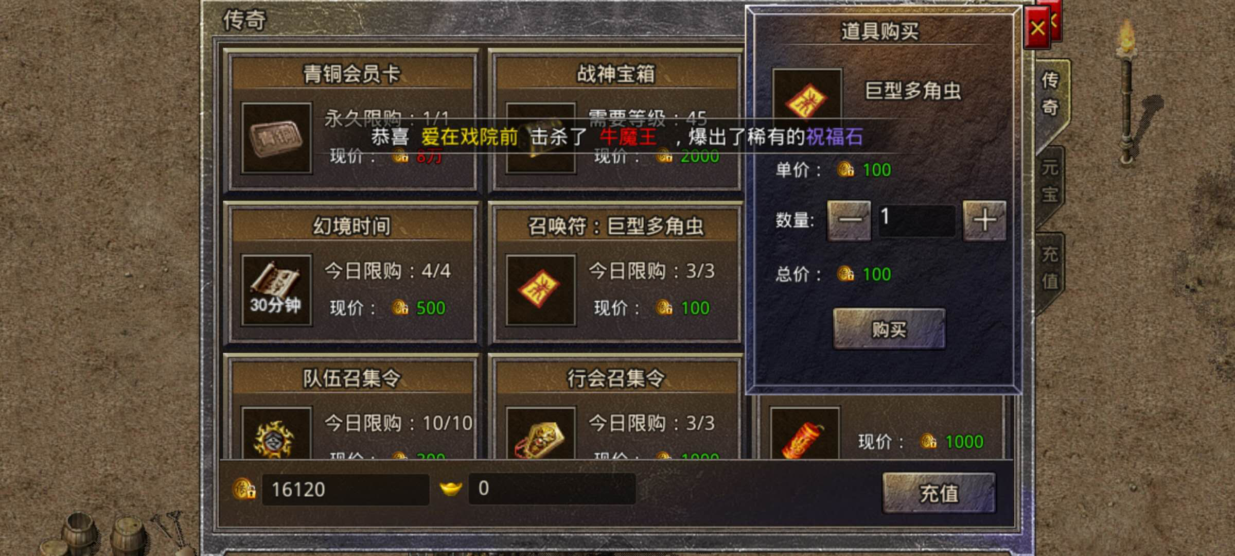 由于召唤符属于消耗类道具,为了满足练级过程中的持续需求,稳定的获取渠道就显得尤为重要。商城是直接购买召唤符的途径之一,其中巨型多角虫召唤符可使用传奇币兑换,每张需要100点传奇币;而虎卫和龙卫的召唤符则需在元宝商店购买,虎卫召唤符售价8点元宝,龙卫召唤符为18点元宝,这两种的价格相对较高。