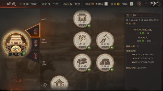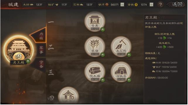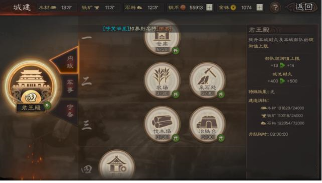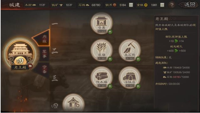 这时,货仓的限制成了阻碍我们升级君王殿的瓶颈。要是按部就班,沿着【把货仓升级到九级】→【将君王殿升级到七级】这条路线推进,我们会在货仓升级上耗费大量时间与物资,严重拖慢成长进度。