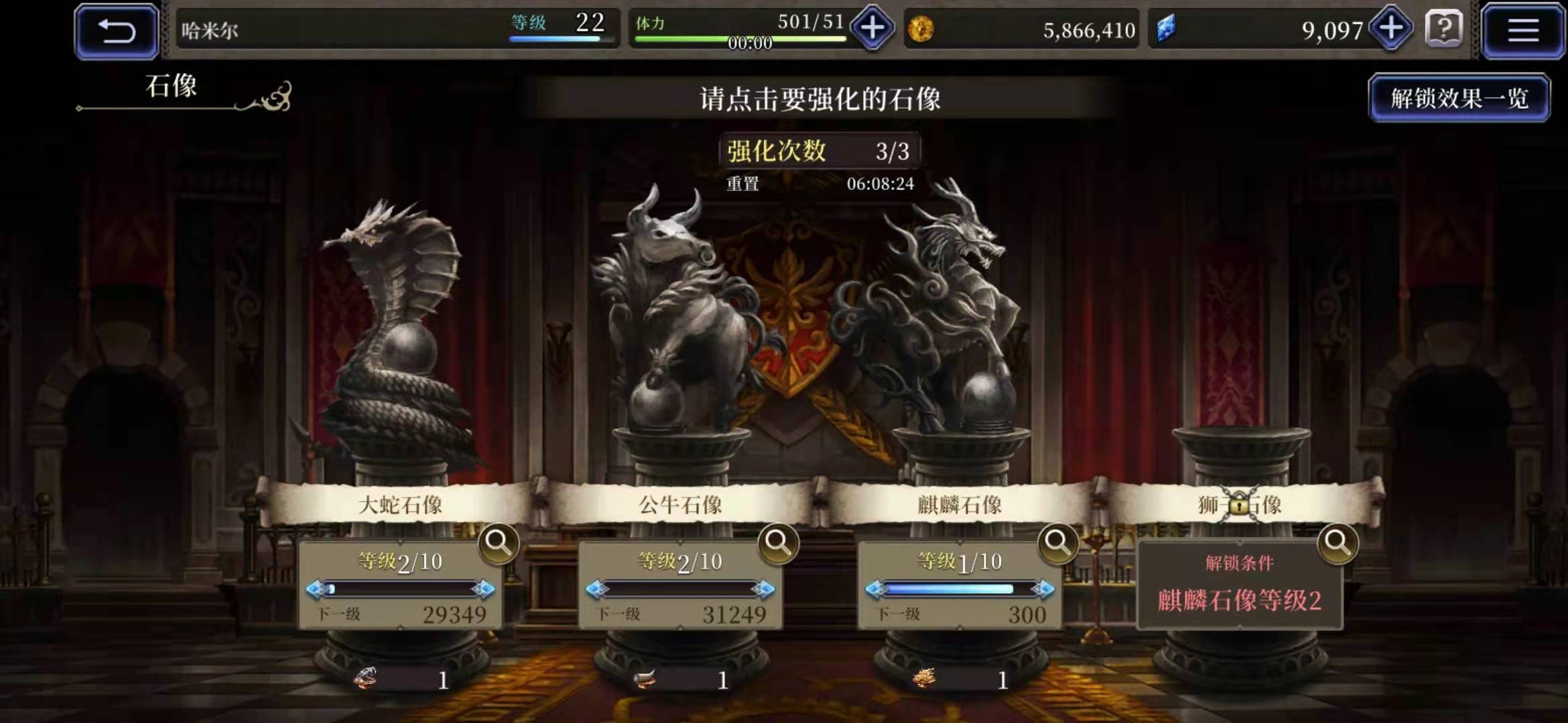 3.公会石像系统包含四座石像,分别为大蛇石像、公牛石像、麒麟石像与狮子石像。玩家每日拥有3次强化石像的机会,随着石像等级的逐步提升,对应的各类效果将依次解锁。