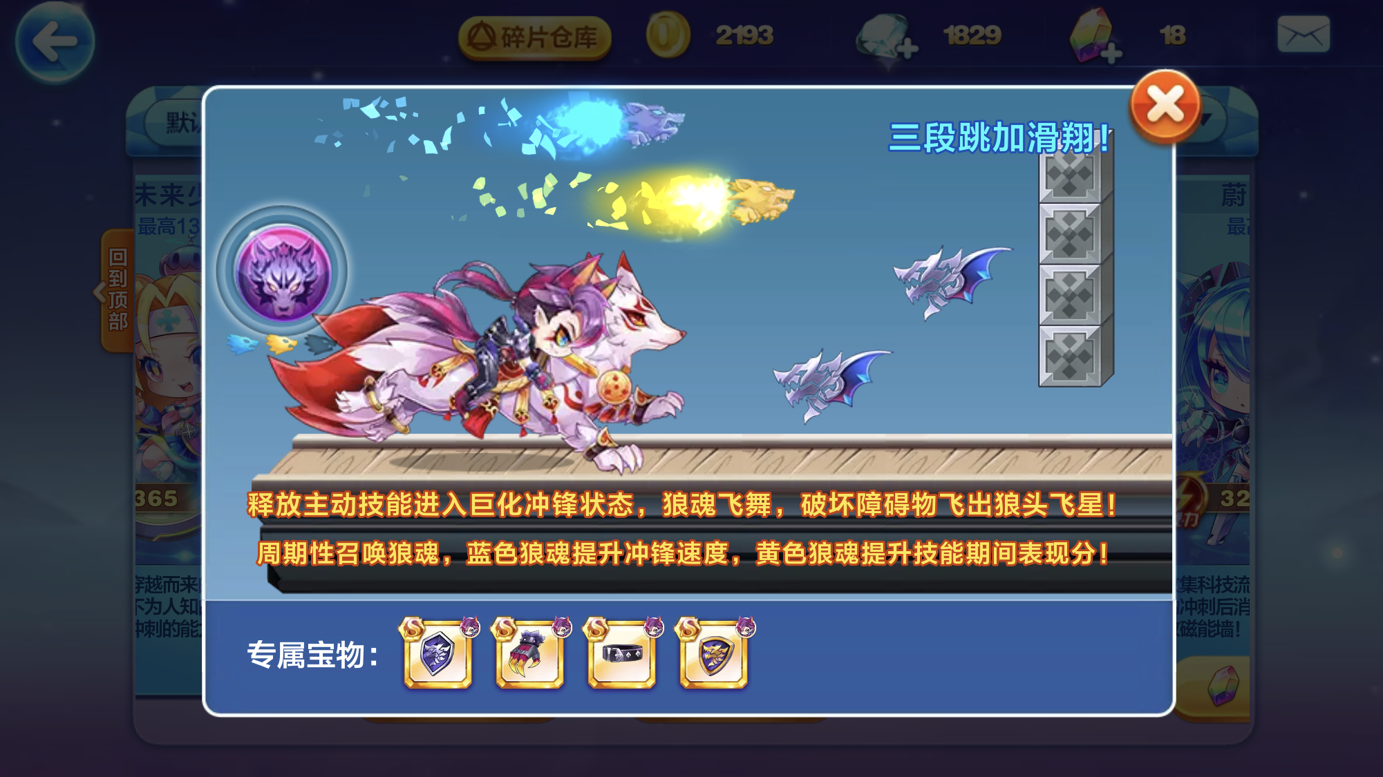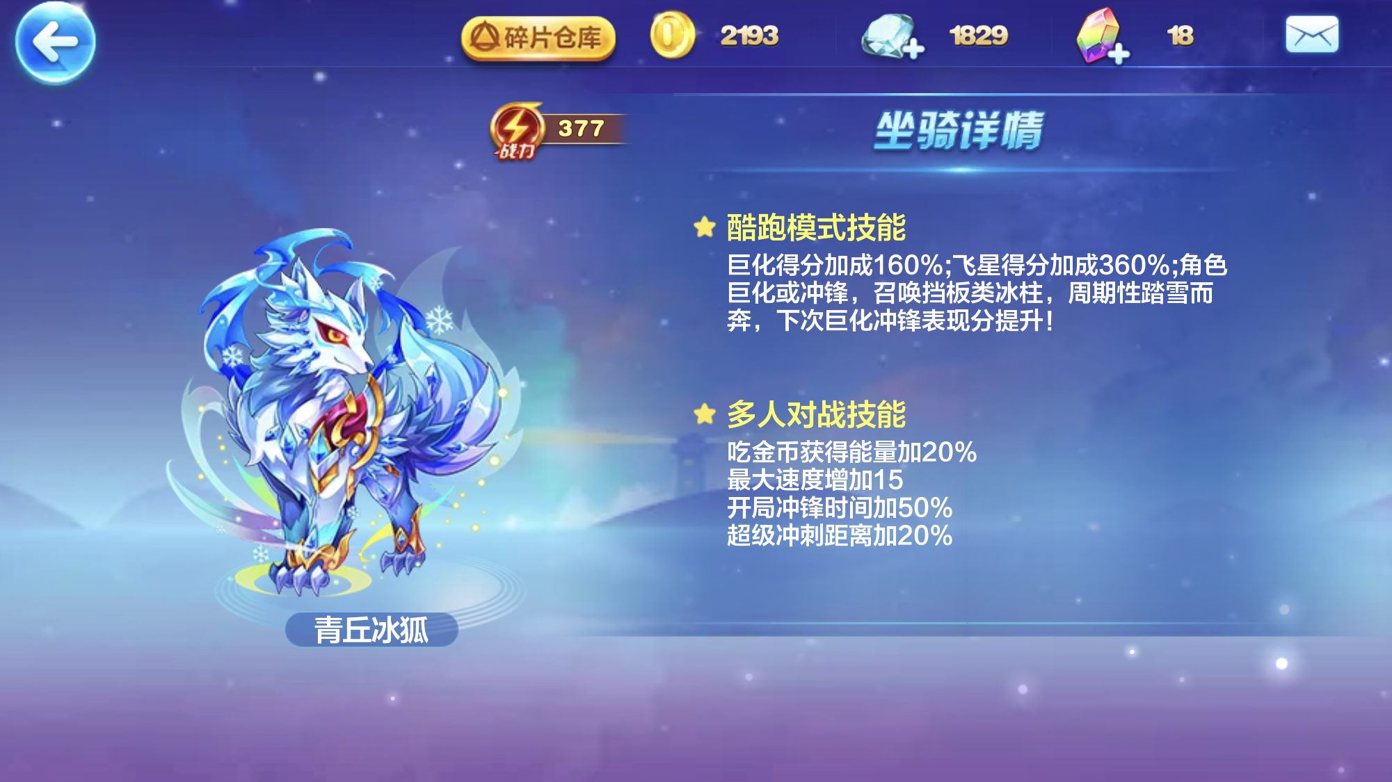 第一个推荐的坐骑是青丘冰狐,它在酷跑模式中的技能包括巨化得分加成160%、飞星得分加成360%,巨化或冲锋时能召唤挡板类冰柱,还会周期性踏雪而奔,使下次巨化冲锋的表现分得到提升;在多人对战模式下,其技能为金币能量加成、最大速度增加、开局冲锋时间延长以及超级冲刺距离增长。这些技能恰好能与月影骑士的技能形成配合,进一步扩大优势。