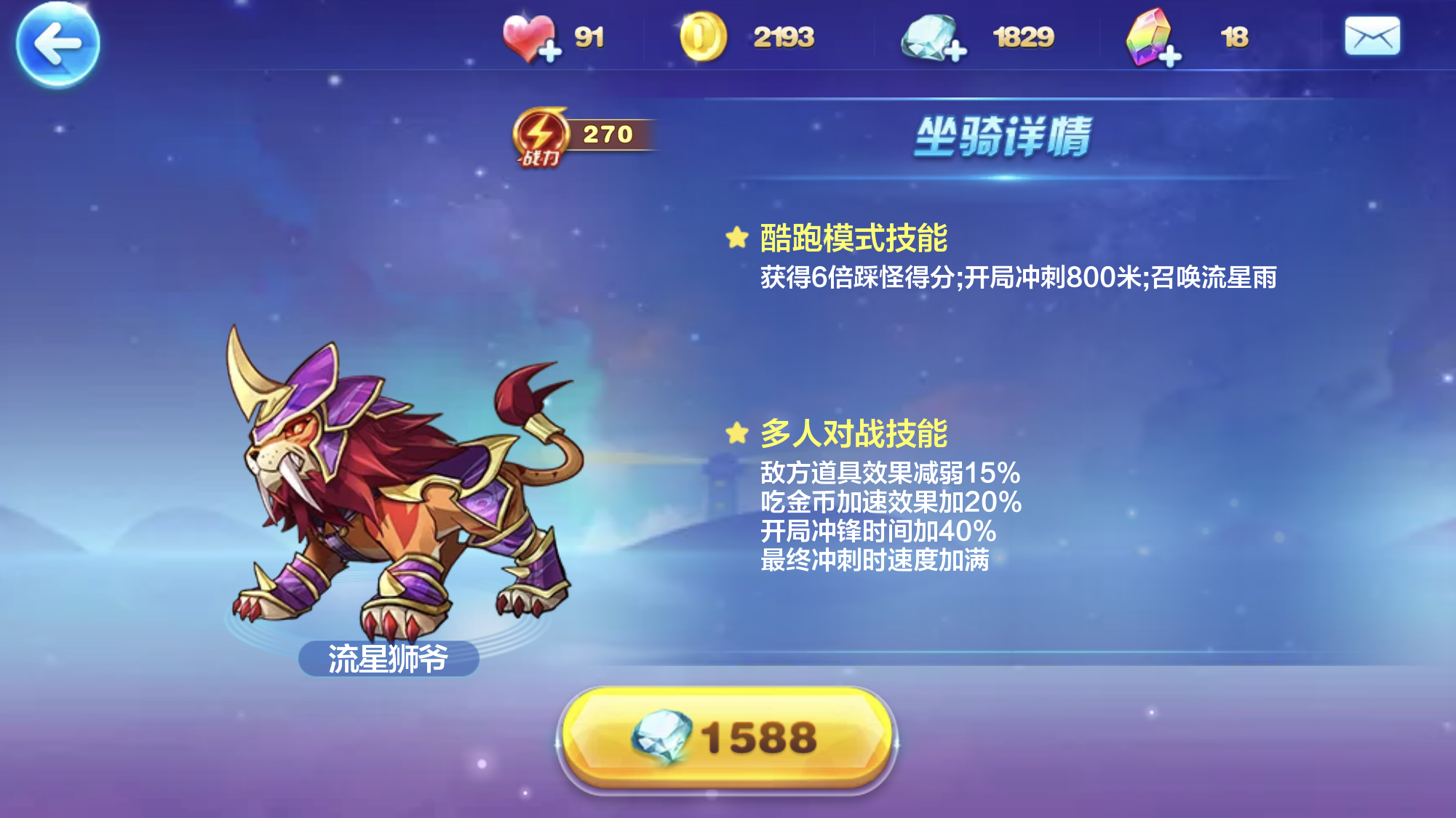 第二个要推荐的坐骑是流星狮爷,它的战力值为270。在酷跑模式下,它的技能包括:能获得六倍踩怪得分,开局时会冲刺800米,还可以召唤流星雨。而在多人对战模式中,它的技能有减弱敌方道具的效果,提升吃金币带来的加速效果,增加开局冲锋的时间,并且能将最终冲刺速度加满。这款坐骑的技能也和月影骑士的技能能够相互配合。