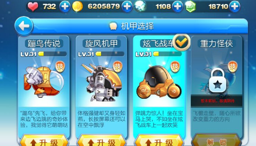 要想跑出令人满意的成绩,机甲选择的重要性同样不容忽视。在炫飞模式中,开场前可以选择一款机甲,游戏里有一次免费召唤机甲的机会,召唤出的机甲能为我们抵御伤害;将机甲升到61级还可解锁机甲防御盾技能,这相当于让机甲获得了多一重保护。