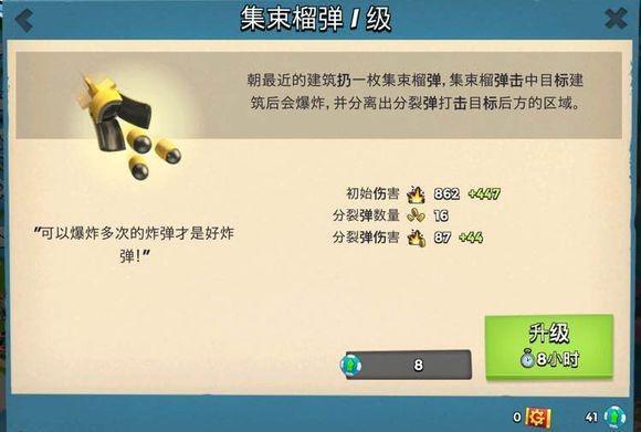 伤害不足,和满级火炮相比,满级火炮的伤害能达到6264点,可满级榴弹的伤害只有4580点。虽说榴弹击中目标建筑后会产生分裂弹,但分裂弹的伤害几乎可以忽略不计,而且其方向也难以掌控。