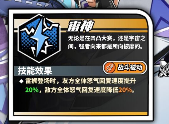 他不仅能对敌人造成大范围伤害,在触发战斗被动技能“雷神”时,还会为己方全体队友提升20%的回复速度,同时降低敌方所有目标的怒气回复速度。不过他的上阵能量要求是19点,因此小编建议在安排他上场前,先部署一个上阵能量需求较低的角色,这样组合使用的效果会更佳。