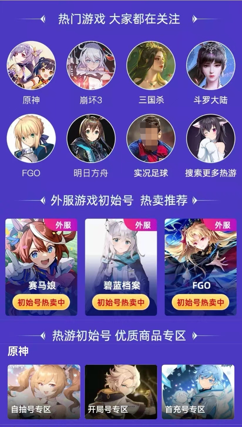 能够呈现给大家的游戏类型十分多样,像王者荣耀、原神、梦幻西游、生死狙击等一应俱全,而且每个游戏对应的账号种类也颇为丰富,包含首充号、内测号、成品号、白号、满级号等多种类型。