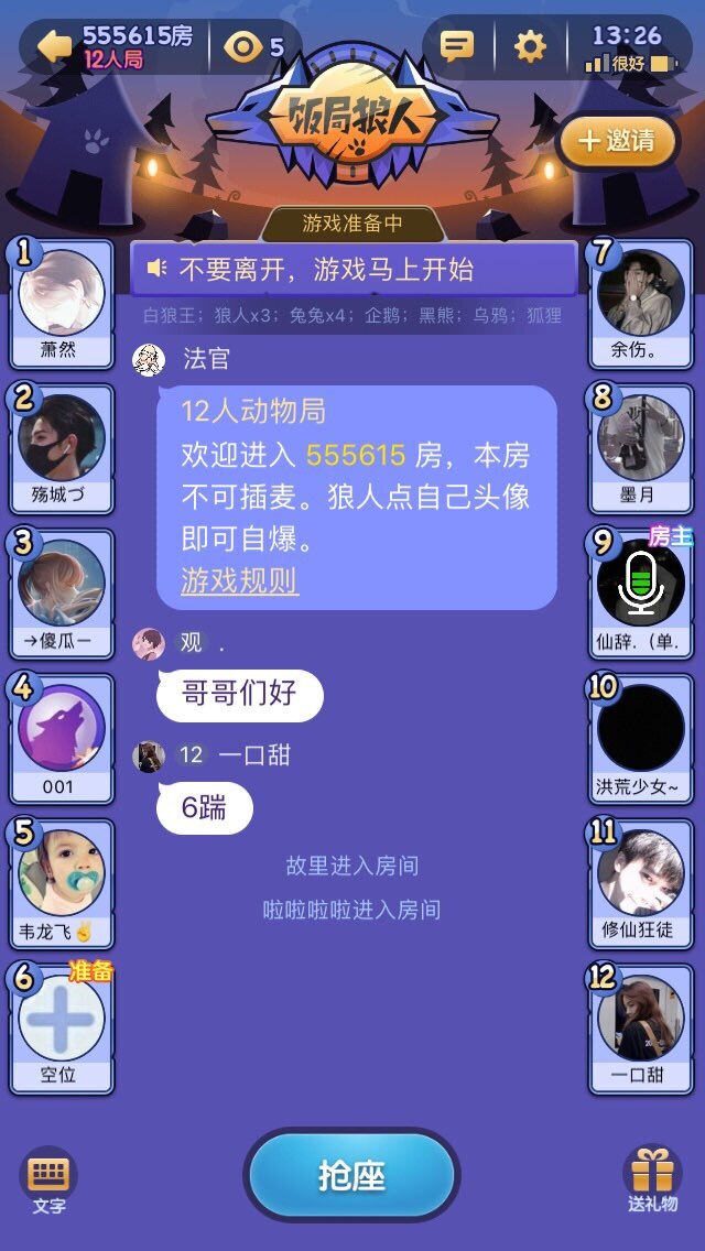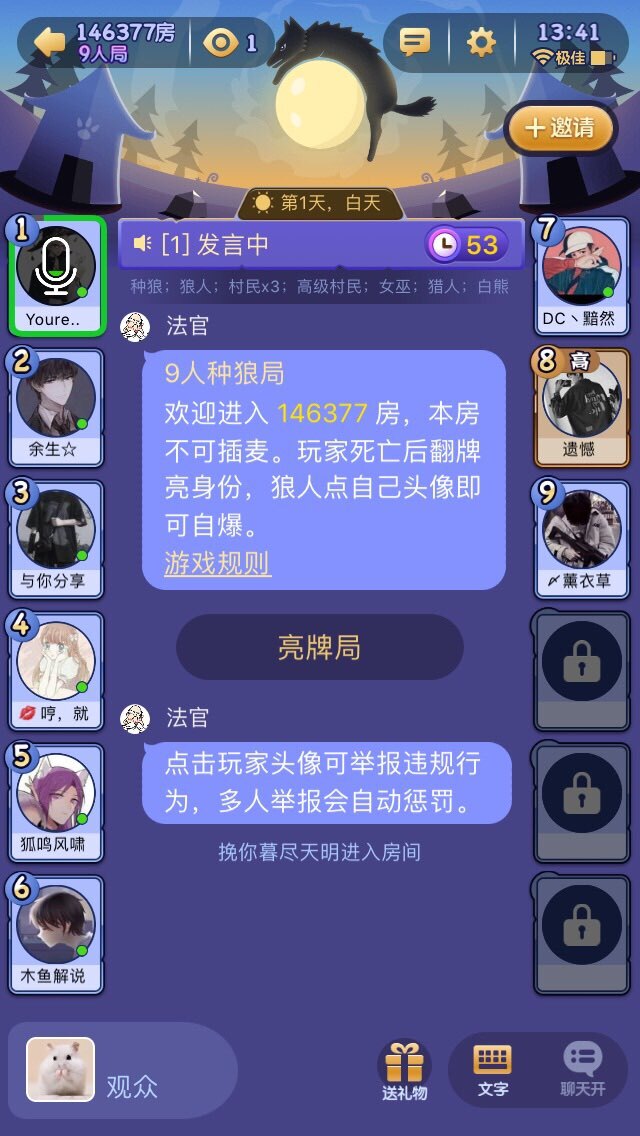 游戏配置如下:狼人三名、村民四名、鬼魂新娘一名、预言家一名、女巫一名、猎人一名、守卫一名。