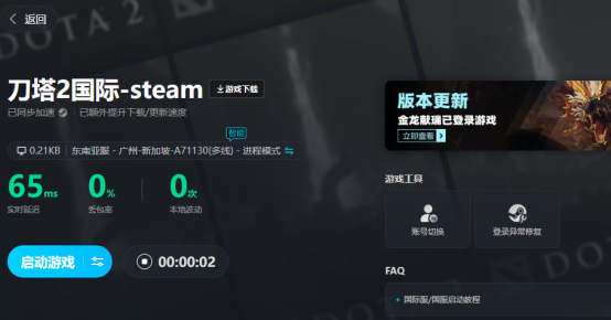 加速器的下载步骤很简单,点击上方链接就能获取正版下载地址,点击绿色安装按钮完成安装后,输入个人身份信息(如身份证号、手机号、验证码等),就能免费领取加速福利。在加速器内搜索“Dota2”找到对应的游戏,点击免费加速就能流畅体验游戏了。