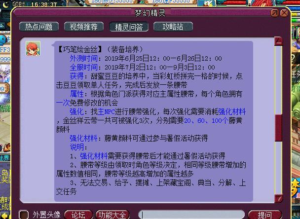 金丝祥云带可在活动任务人处更换输出主属性,首次获取免费,第二次则需10万游戏币,因此建议尽量争取免费获得该腰带。玩家可用活动道具“藤黄”对其进行属性强化,“藤黄”每完成二十环活动必定获得一个,也可通过其他暑期玩法有一定概率掉落;腰带最多可强化3次,强化周期较长,但一条腰带的使用期限至12月3日。对于参与简单活动的玩家来说,它能有效提升效率,还可节省装备耐久。