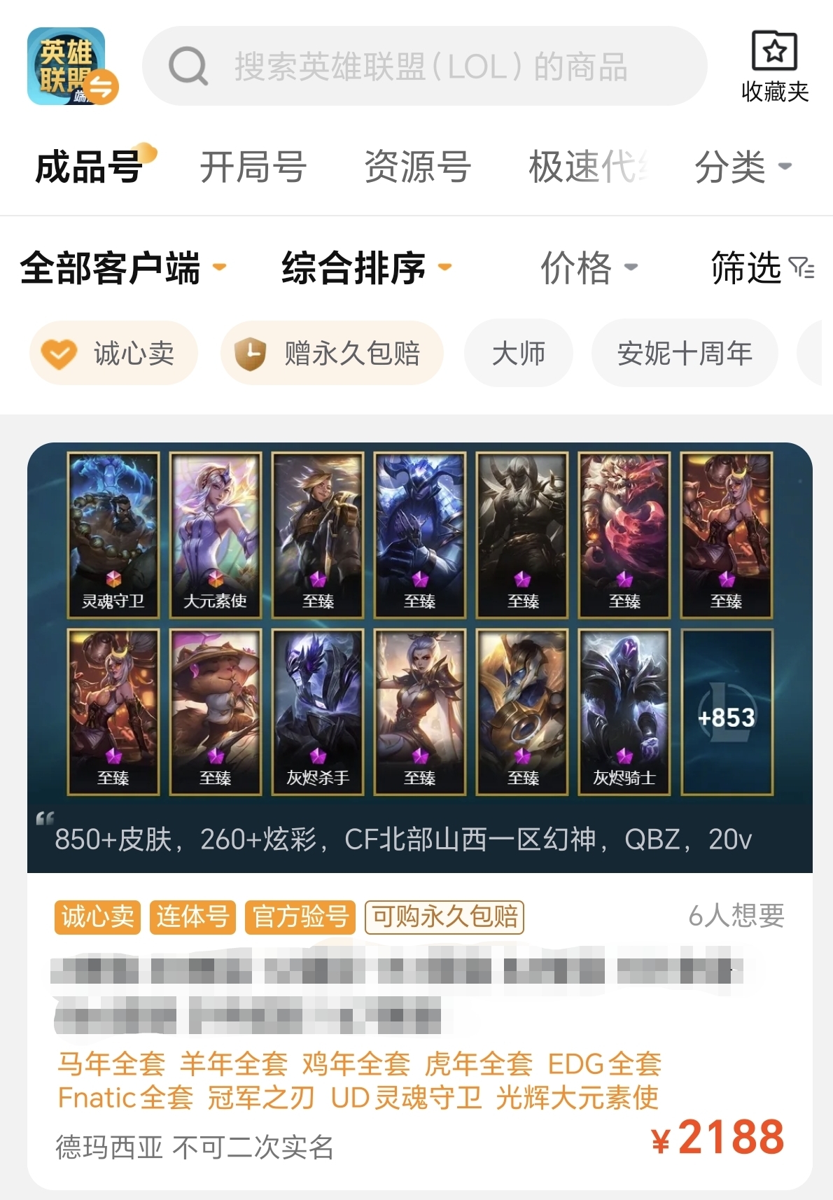 不包含皮肤的全英雄账号,价格大概在几百元上下。不过要是加上皮肤,价格就会有很大差别了——毕竟每个账号的皮肤数量和品质都不一样,特别是那些收藏价值高的皮肤,价格肯定更贵。在交易猫平台上,英雄联盟账号的售价从几百元到上千元都有。每个要卖的账号都会把拥有的英雄、皮肤、段位等级这些信息列得很详细,这些具体信息能帮买家做决定。