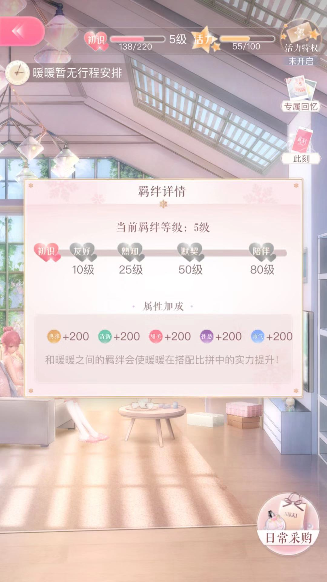 4、在聊完专属回忆后,我们接着谈谈羁绊。羁绊等级越高,暖暖在和其他人进行PK时的实力也会相应增强,它总共被划分为初识、友好、熟知、默契、陪伴这5个等级。