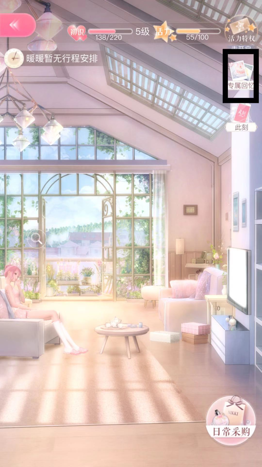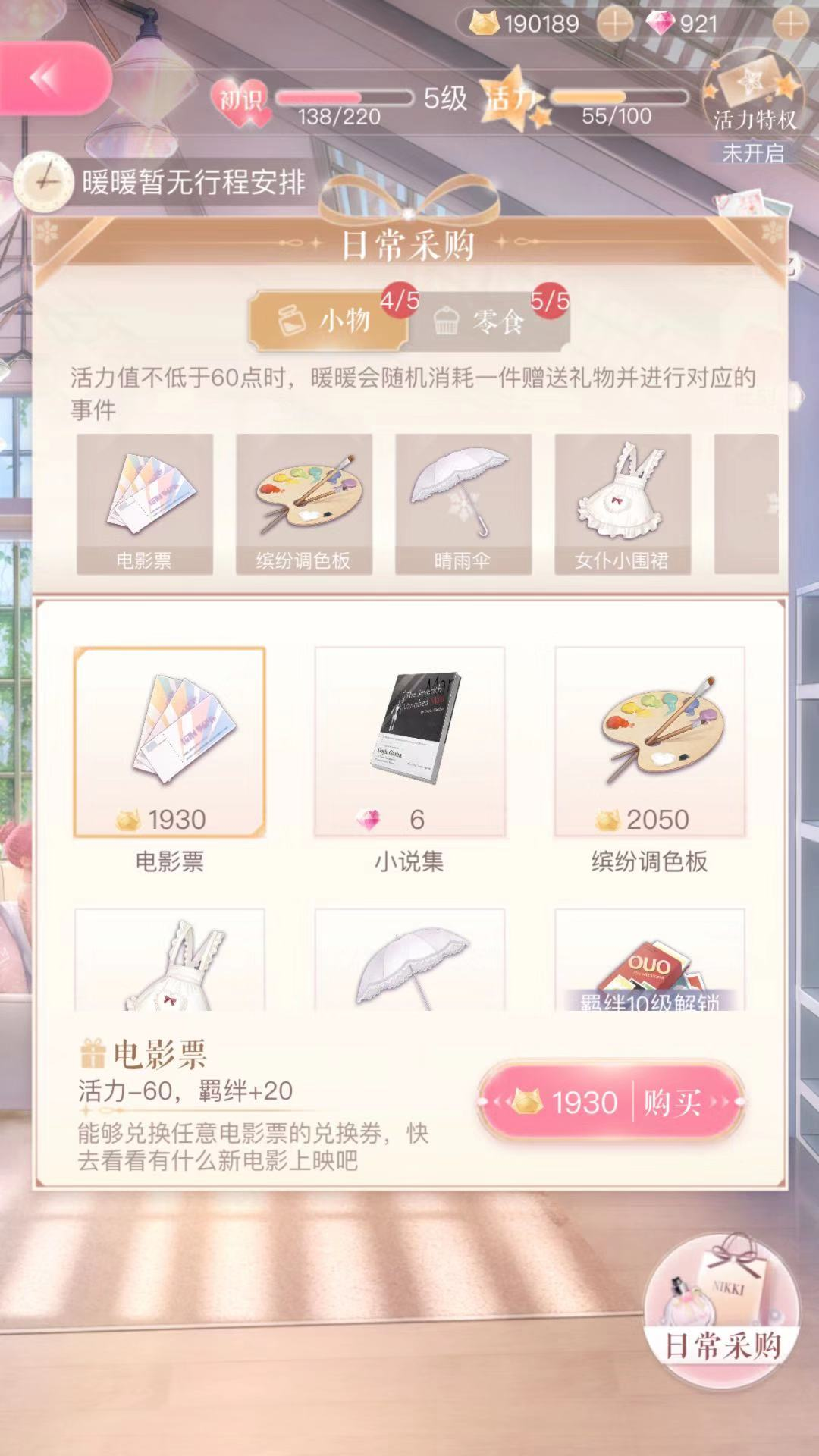 5、那么羁绊要如何提升呢?可以及时给暖暖添置一些小物件。在界面右下角的日常采购里,我们能为暖暖购买像小说集、电影票这类小物品,完全不用操心怎么使用,因为暖暖会自动去阅读或使用!你只需要记得及时去添置就好啦。