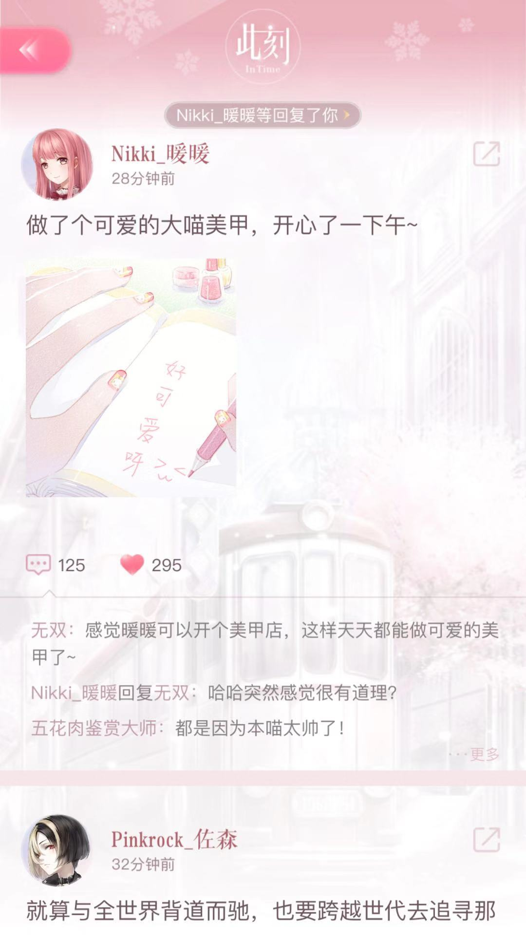 8在暖暖的家中还有个有趣的玩法叫“此刻”,它就在专属回忆板块的下方。点进去后界面有点像朋友圈,能点赞也能评论,里面会出现不少人物,比如你拥有的设计师、暖暖本人,还有一些“新闻”里的角色等等。