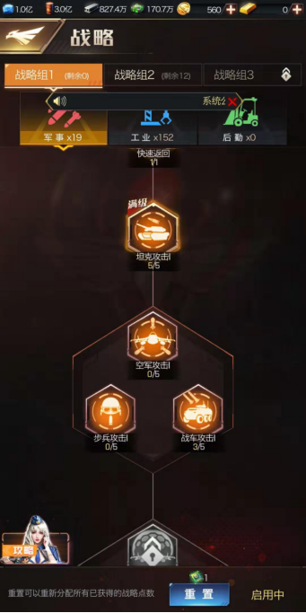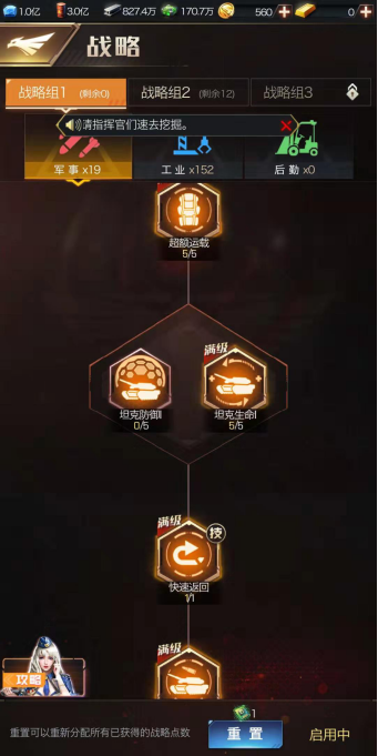 战略主要分为军事、工业、后勤这三类,英雄类型与之对应,因此二者必然存在关联。要是指挥官的VIP等级达到7级及以上就再好不过了,这样就能自由切换三种战略——也就是说,每个战略组可以只专注于一种类型:一个只点军事,一个专攻工业,一个只发展后勤。如此一来,在面对不同时期和场景时,就能让自身实力得到最大化发挥。