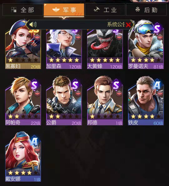 一、首先梳理自己拥有的全部英雄:点击界面中类似下图所示的“英雄”选项,进入英雄详情界面后,点击“军事”分类,这里展示的就是个人持有的军事英雄。可以逐个查看具体有哪些——军事英雄是分类型的,涵盖坦克、战车、步兵、飞机等不同兵种,也有通用型;同时还区分攻击型和防御型。