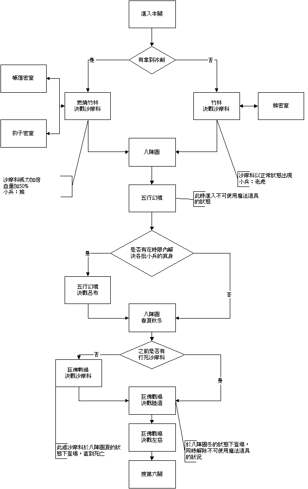 这一关属于第三关边路方向的关卡路线,是否获得冰剑会决定你是否会在那里遇到沙摩柯。五行幻境的前半段没有任何限制,进入五行幻境之后,就不能使用任何魔法道具了,直到陆逊出现才会解除这个限制。需要特别注意的是,在这个阶段你会遇到游戏中更强大的BOSS吕布,所以要利用好必杀技和投掷道具来快速攻击吕布。