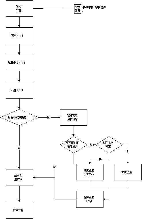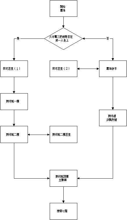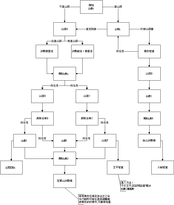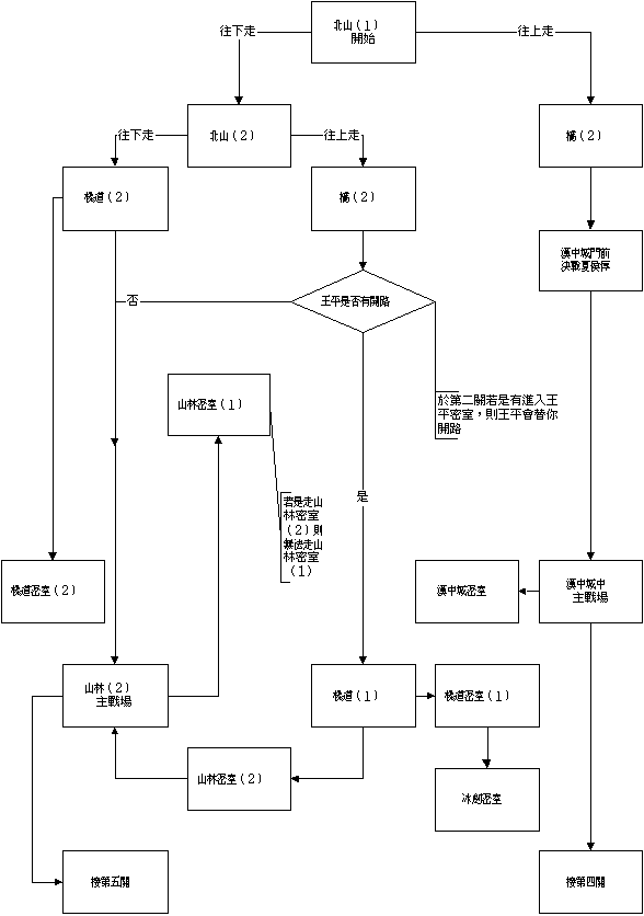 这一关的地貌比第2关更复杂,初始向上走会通往荆州方向,初始向下走则通往八阵图。需要注意的是,这一关中如果之前进入过王平密室,王平就会帮忙开路(要是选进密室后又击杀王平,大家可以试试会发生什么,这里我没尝试过);但如果走边路、之前没进王平密室,就会错过获取冰剑的机会。