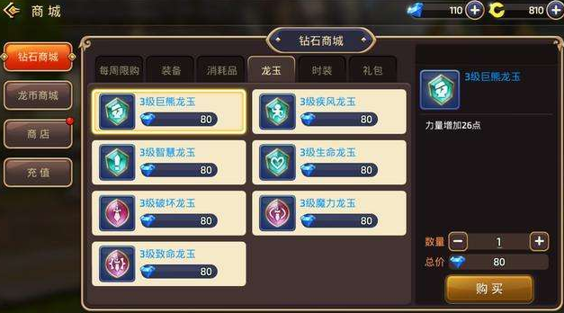 龙玉的获取途径十分丰富,像活动、抽奖、任务等都能得到,不过通过这些方式拿到的一般都是一级龙玉。而更直接的获取方式是商城,钻石商城和绑钻商城里都有龙玉售卖,这两个商城的龙玉没什么区别,全是二级龙玉。