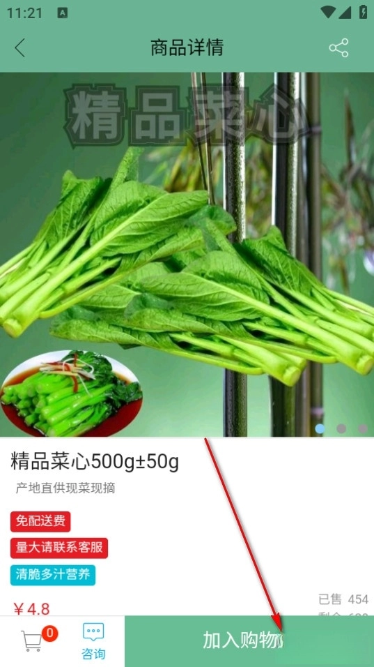 在商品详情页点击下方加入购物车即可进行购物结算。