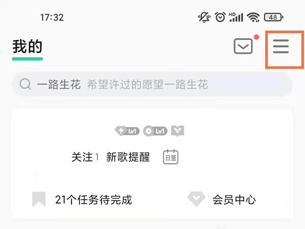 打开,在我的音乐点击右上角三横线进入更多页面。