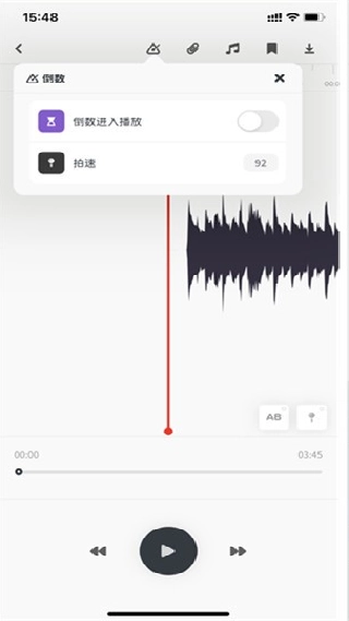 软件会将其转化为一个工程项目,在播放控制页面可以看到对应的波形。点击最上方的按钮,就能查看并使用倒数进入播放、拍速功能,并且还能设置小节的循环。