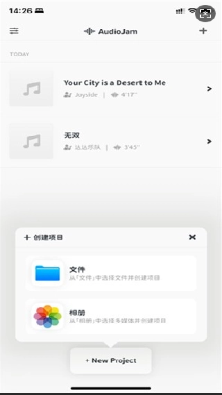打开AudioJam软件,找到界面底部的“+”按钮并点击,然后选择文件或相册选项,上传需要提取音乐的视频文件。