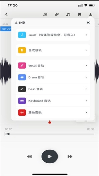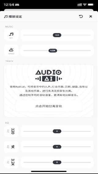 要是想分离当前正在播放的音乐,你可以点击右上角的播放设置按钮,接着在TRACK选项中找到并点击AUDIOAI功能。此时音频文件会被上传到云端进行分析处理,之后系统会把生成的多个独立音轨下载到本地,这样就完成了音轨分离的操作。