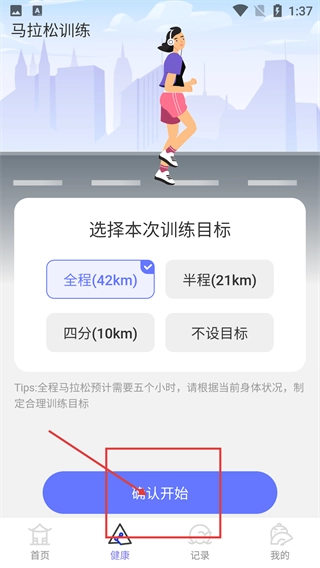 在马拉松训练页面,选定训练目标(例如全程42公里)后,点击【确认开始】按钮,就能开启训练计时流程。