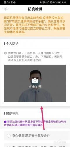 6、上传出车照,点击“去上传”,需要佩戴口罩。