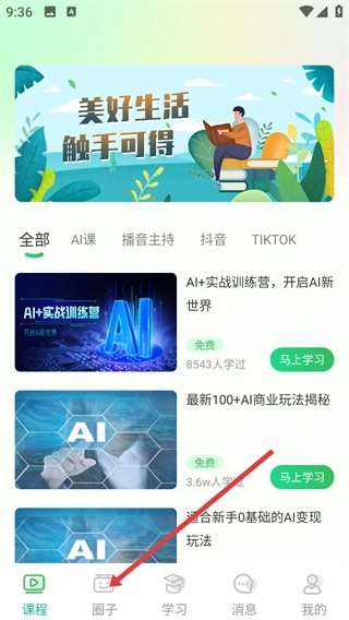 在课程页面底部找到【圈子】按钮,点击它就能进入圈子板块,浏览各个圈子的相关内容。