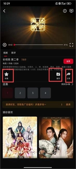 在视频播放小窗口区域,你可以通过点击五角星图标来收藏视频,点击缓存图标进行视频缓存,还能点击分享图标将视频分享给好友。