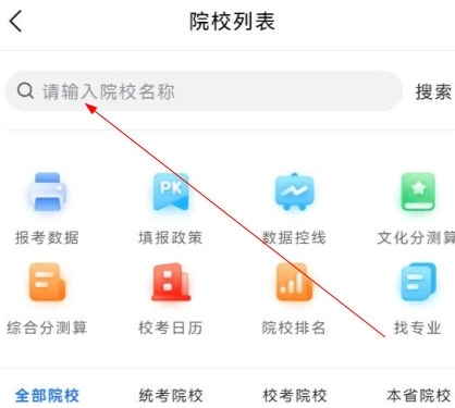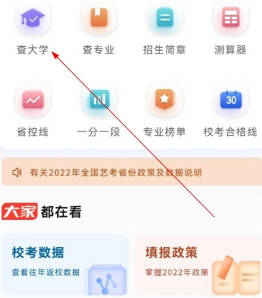 打开艺考志愿填报,点击首页“查大学”