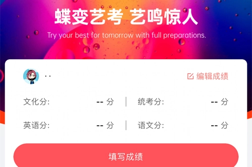 接下来我们就进入到首页了,大家能看到【填写成绩】这个选项,点击进去就能直接填写。不过关键是要先把版本切换到艺考版本,这样后续操作才能顺利进行。