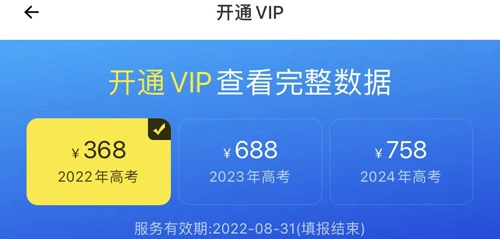 使用这款志愿填报工具时,若想获取全面的院校及专业数据支持,建议通过开通会员权限来实现更完整的功能体验。关于会员服务的定价,这里为大家说明一下:针对2022届高考生的短期套餐,现价368元(原价598元),服务有效期截止至2022年8月底;覆盖次年高考的年度套餐,现价468元(原价688元),有效期至2023年8月底;还有可使用至2024年8月底的长期套餐,现价568元(原价758元)。