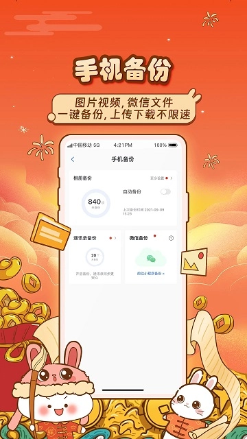 可以让用户轻松保存自身的图片、视频和文件资源,并且能够随时进行文件备份。