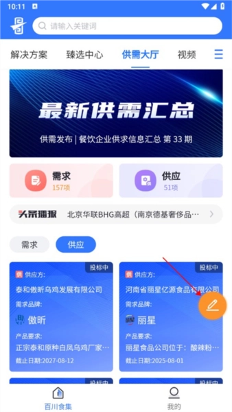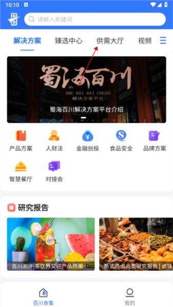 1、打开蜀海百川,在首页顶部找到供需大厅并点击进入;