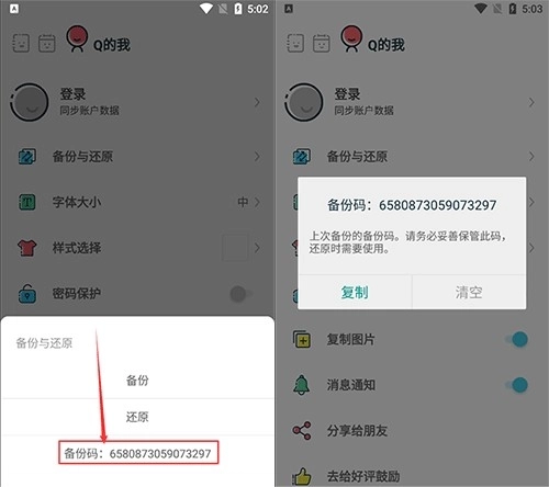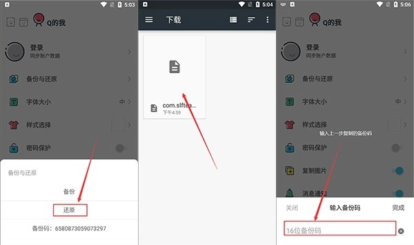复制完成后,选择【还原】,然后找到你要还原的数据后,输入备份码,最后点击完成即可;