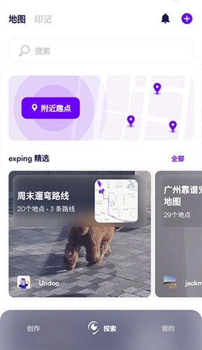 1、切换至探索模式,进入exping的品味社区,这里汇聚着创作者们的探索踪迹。你能够借助附近趣点,查看其他创作者在周边地点留下的探索印记,常常能发现身边不少令人惊喜的地方。