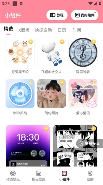 1、打开应用后,点击底部的“动态壁纸”标签,即可进入精选动态内容的分类页面,这里支持可爱、简约等多种主题供用户挑选。