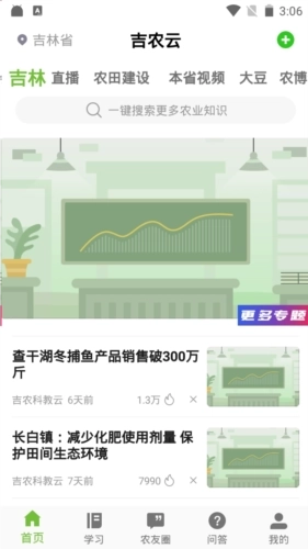 1、吉农云会设置问答、农情、服务日志等多种问答内容相关栏目;