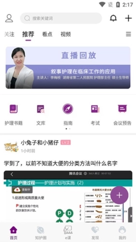 2、在这里,大家可以查看护理相关的书籍、文库、指南以及会议预告。