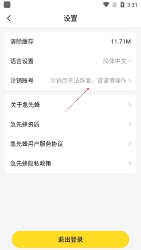 急先蜂支持账号注销操作,注销流程十分便捷:用户只需进入软件的设置界面,找到并点击其中显眼的注销功能选项,就能完成账号注销。