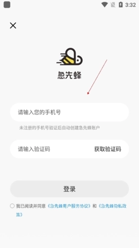 要使用急先蜂的各项功能,用户必须先完成账号注册;若尚未注册,可通过手机号码进行注册操作;而用户登录时,同样需要通过手机号获取并输入验证码。