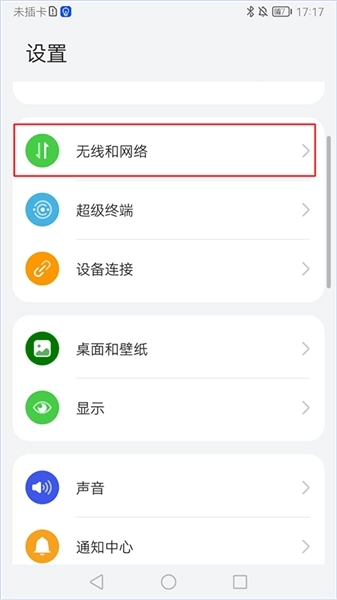 1、进入手机的设置界面,接着在该界面里找到并点击“无线和网络”选项。