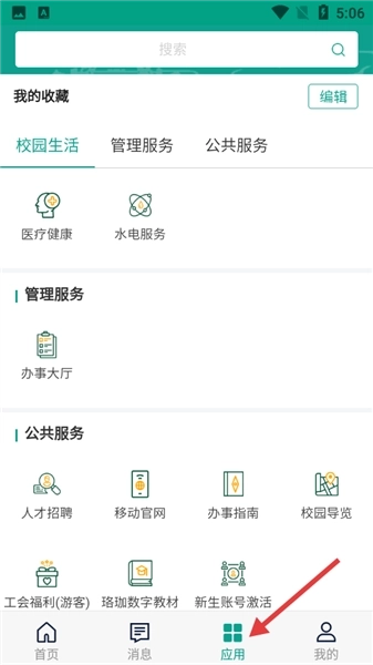 3、应用总览页面设有搜索功能和我的收藏板块,分类展示校园生活、管理服务等各类内容,以满足校园事务办理需求。
