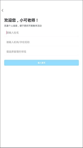 2、首次登录时,输入验证码就能进入软件,之后完善姓名、所属机构/学校名称以及负责管理的学段,即可完成注册。