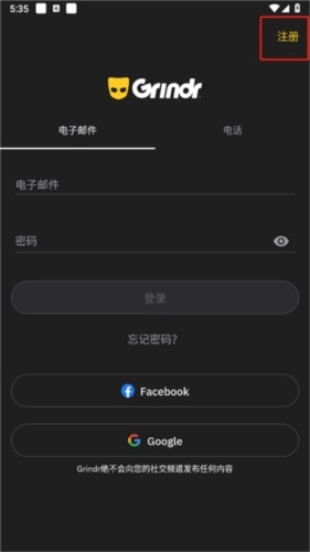 1、启动Grindr应用,进入登录界面后,点击右上角的【注册】按钮;