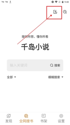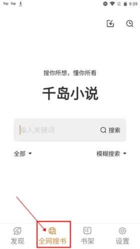 1、先打开“千岛小说”,接着点击底部的“全网搜书”页面;