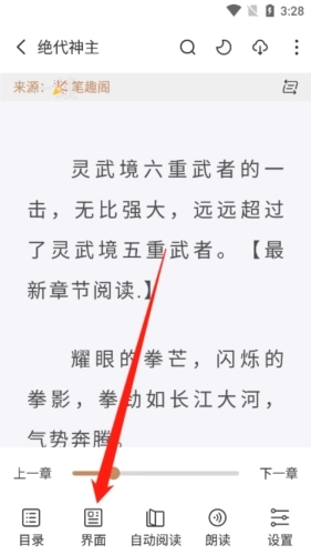 2、接着在小说阅读页面点击屏幕,待弹出页面后,点击下方的“界面”选项。