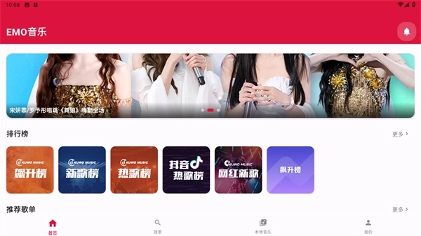 1、首先进入界面后拥有排行榜以及推荐歌单提供选择聆听;
