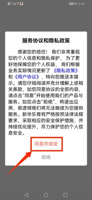 1、首次打开应用时,请在弹出的服务协议窗口中点击同意并接受。